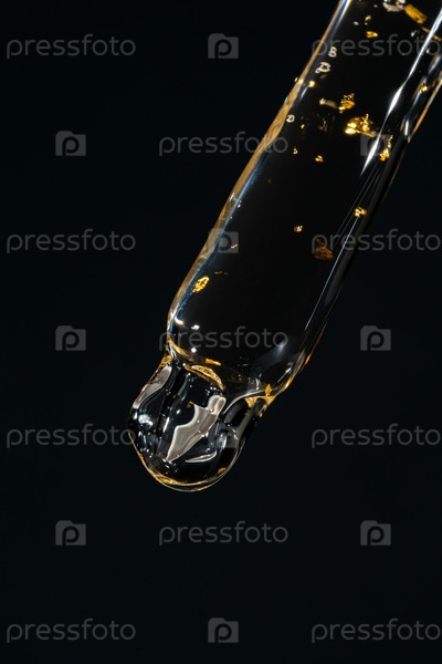 Косметическая пипетка с капающей сывороткой для лица из 24-каратного золота на черном фоне, сыворотка, сыворотка, гель, витамин, вода, масло