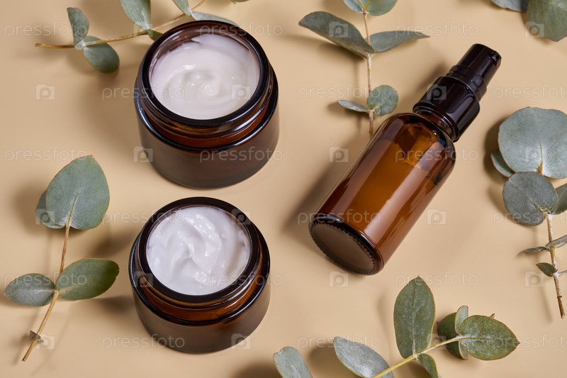 Набор косметических флаконов из янтарного стекла на бежевом фоне. Флакон-капельница и баночка для крема. Дизайн упаковки косметических средств по уходу за кожей для ежедневной рутины