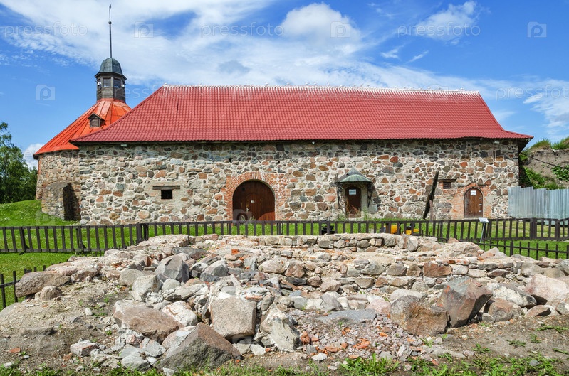 Круглая надвратная (Пугачевская) башня и старый арсенал в крепости Корела, в солнечный летний день. Приозерск