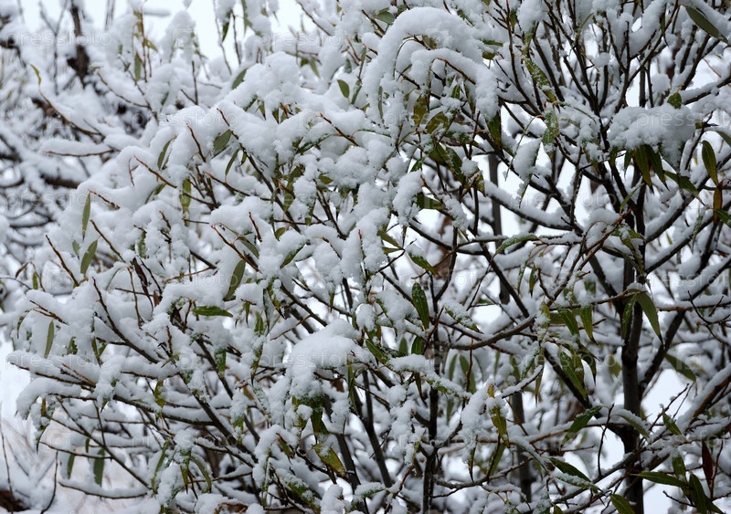 Первый снег на деревьях с зеленой листвой