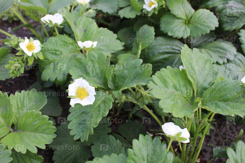 Кусты цветущей клубники с мелкими белыми цветками весной плодоносят