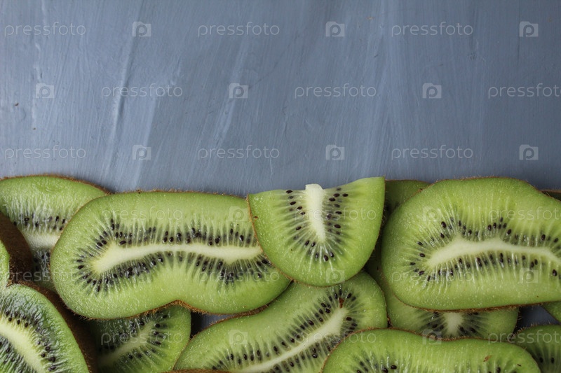 Кусочки киви на сером фоне с местом для текста copyspace. 1 12 свободных мест. Сезонный фон