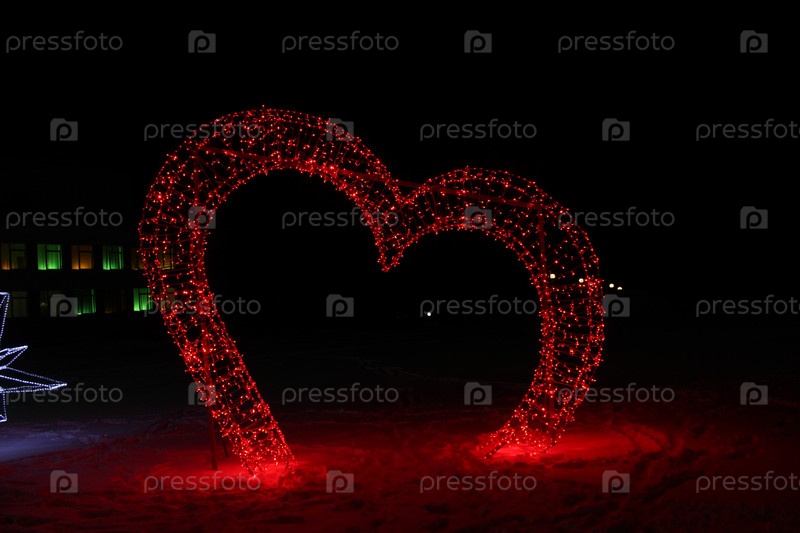 Рождественская неоновая фигура Красное сердце на улице. Уличные фигуры на Рождество