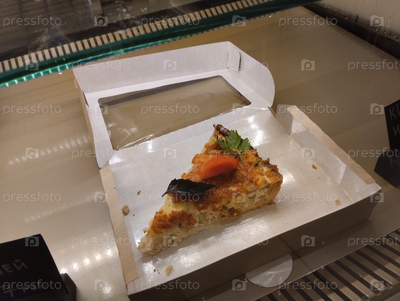 Пирог-киш. Кусок пирога-киш с рыбой, мясом и листом базилика. Традиционная выпечка