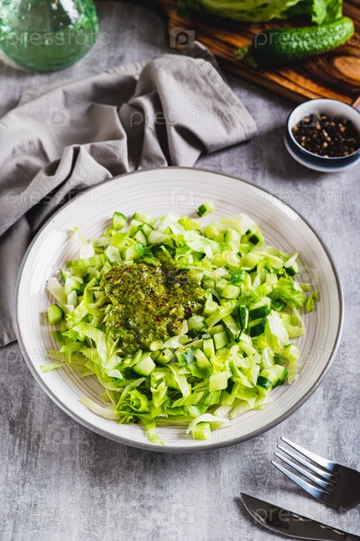 Острый салат с огурцом и салатом айсберг на тарелке на столе вертикальный вид