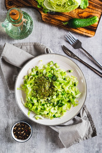 Острый салат с огурцом и салатом айсберг на тарелке сверху и вертикально
