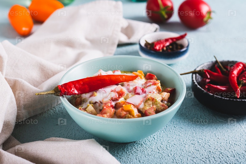 Острая сливочная мексиканская сальса в миске на столе