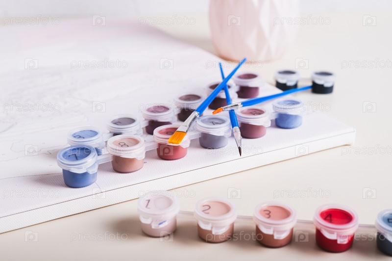 Кисти, разноцветные акриловые краски и холст для раскрашивания по номерам на столе