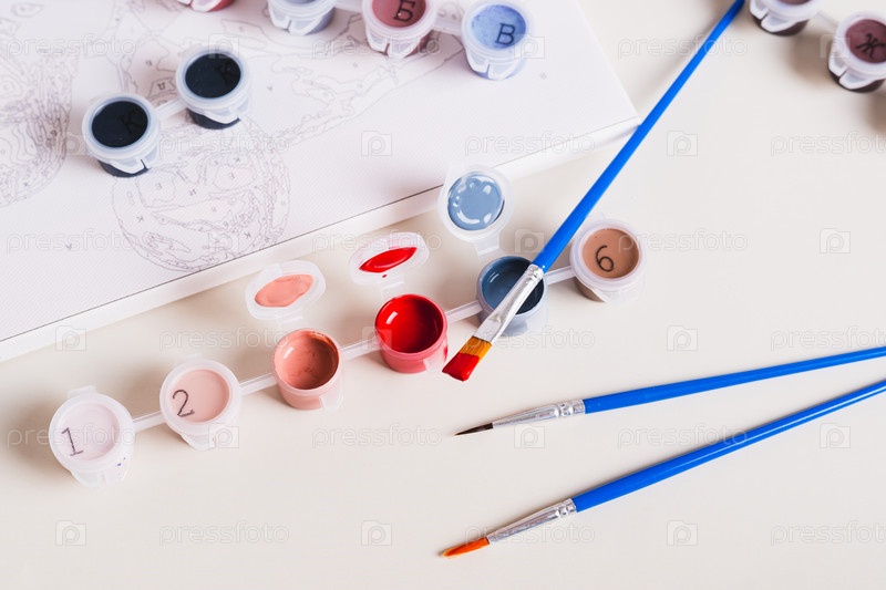 Кисть, смоченная в красной акриловой краске и емкости с красками для написания картины