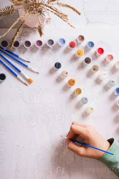 Девочка рисует картину по номерам кисточкой, используя набор для рисования сверху и вертикально
