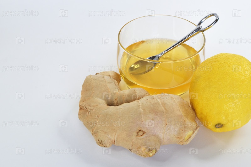 Лимон и корень имбиря на переднем плане и стеклянная чашка с медом позади