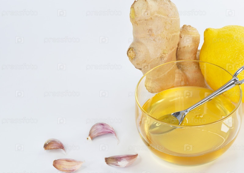 Чашка меда, лимон и корень имбиря рядом с зубчиками чеснока, посыпанными