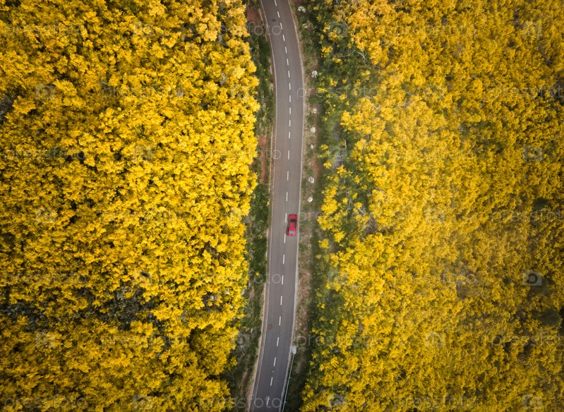 Вид с воздуха на дорогу среди цветущих кустарников Cytisus возле Пику-ду-Арейро, Португалия