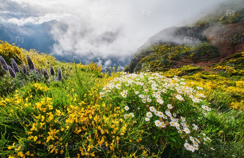 Ландшафт Мадейры с цветами маргаритки и цветущими кустарниками Cytisus, Португалия