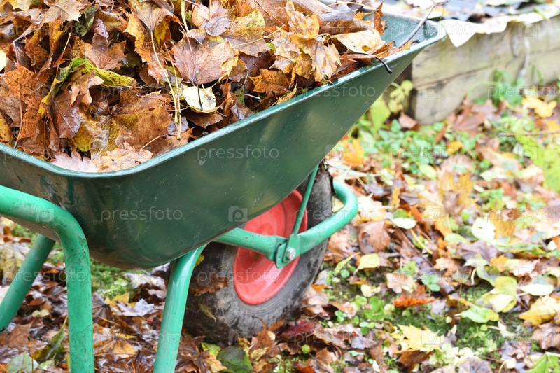 Садовая тележка, наполненная опавшими листьями