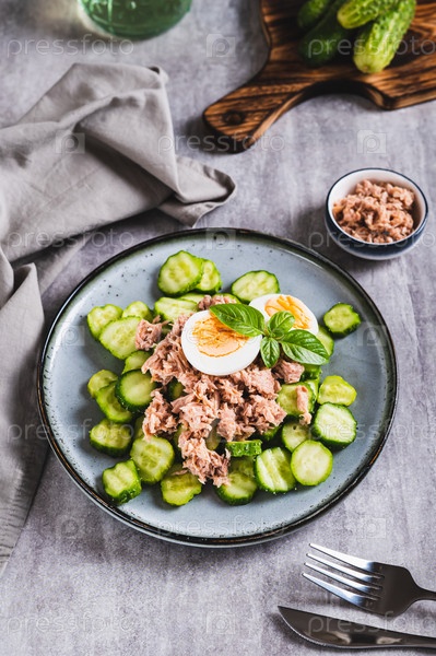 Кето-салат с тунцом, огурцом, яйцом и базиликом в миске на столе вертикальный вид