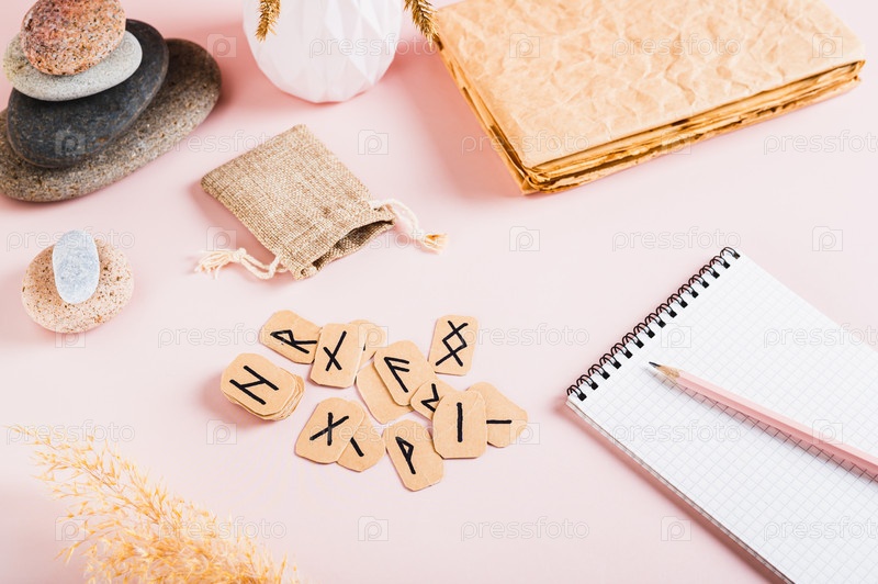 Картонные скандинавские руны для гадания на розовом фоне