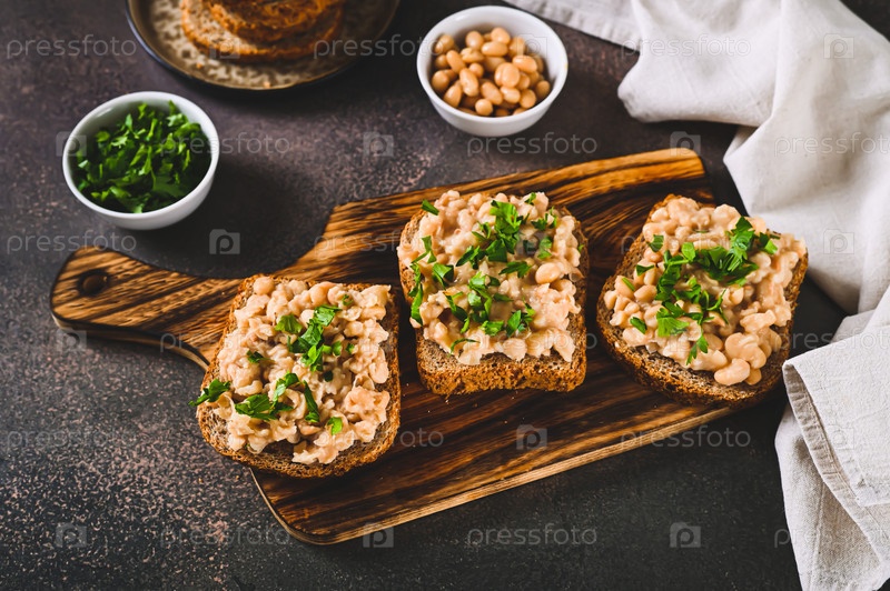 Брускетта с пюре из белой фасоли и петрушкой на ржаном хлебе на доске