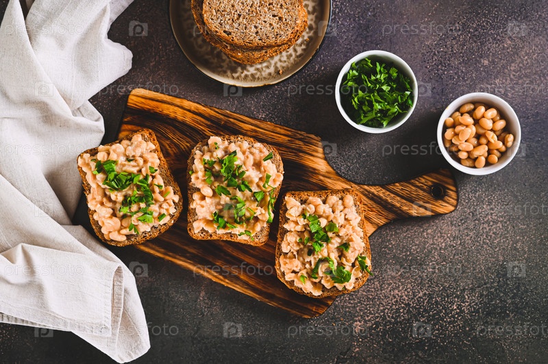 Аппетитные бутерброды на зерновом хлебе с пюре из фасоли и зеленью на доске вид сверху