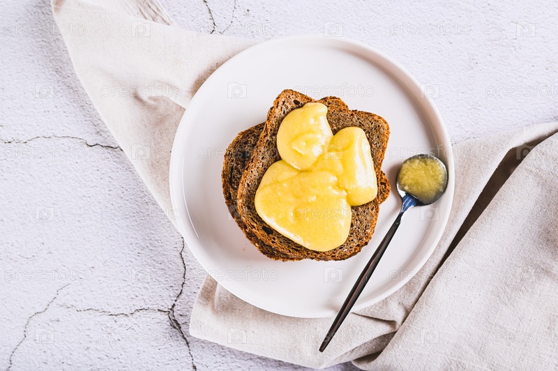 Крупный план сэндвичей на зерновом хлебе с медовым маслом на тарелке на столешнице
