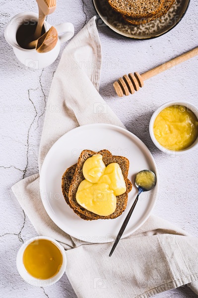 Вкусные тосты с медовым маслом на тарелке на столешнице и вертикальный вид