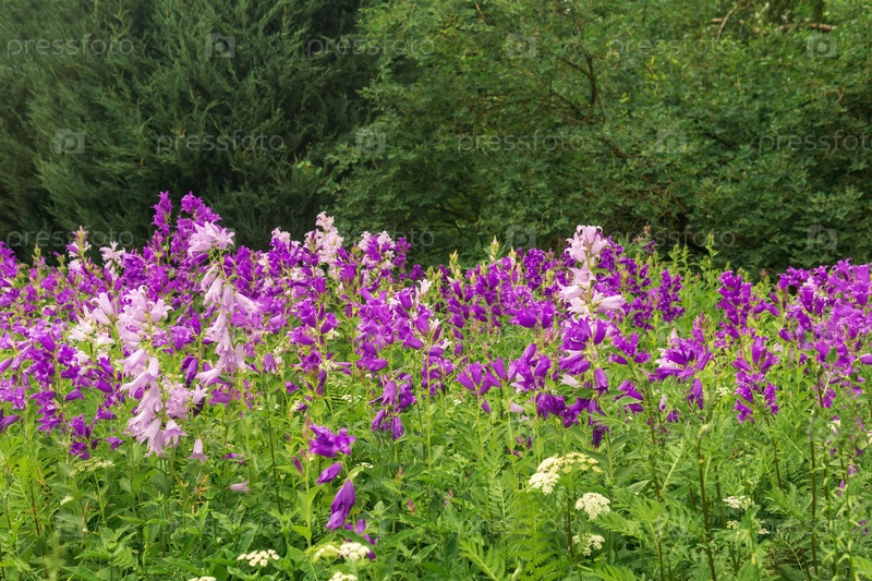 Пейзаж, поле фиолетовых колокольчиков на опушке леса крупным планом