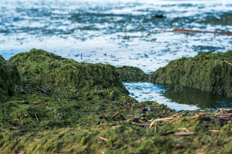Размножение водорослей на берегу моря во время цветения воды