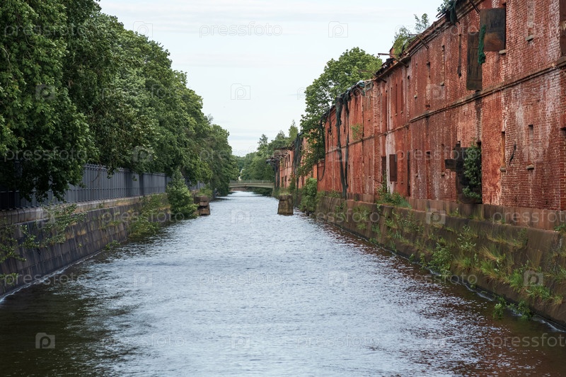 Вид на старый дренажный канал с заброшенным складским зданием на берегу