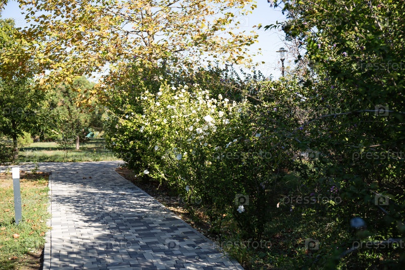 Дорожка из каменной плитки в ореховой роще Анапы летом