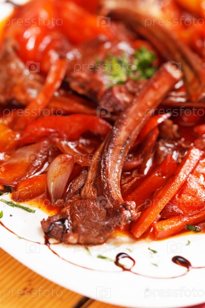 На гриле ребра с овощами