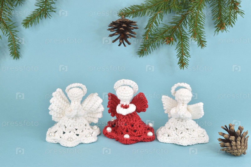 Три ангела, связанные крючком из тонкой пряжи, стоят под еловыми ветвями