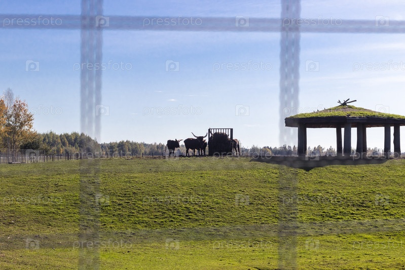 Снимок породы крупного рогатого скота с огромными рогами. Животные