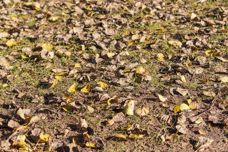 Сухие листья и ветки на земле в лесу. Фон