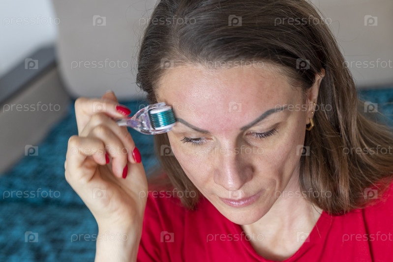 Женщина использует микроигольчатый дермароллер для ухода за кожей лица и шеи. Косметика