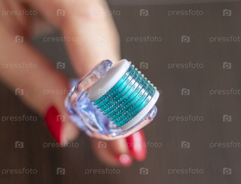Женщина держит микроигольчатый дермароллер для ухода за кожей. Уход за собой