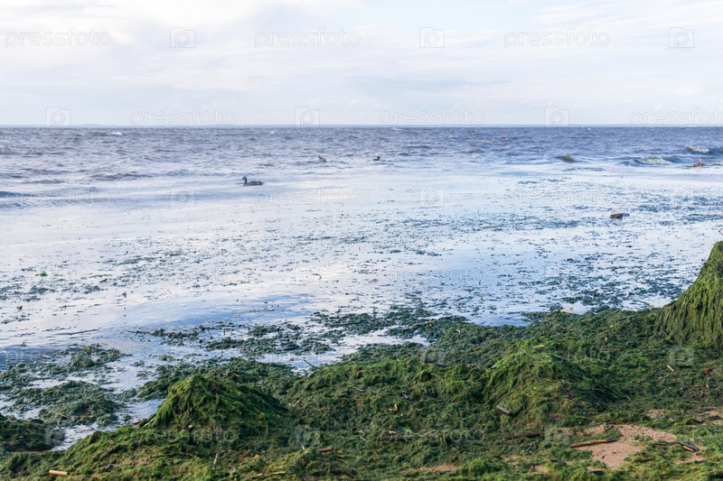 Размножение водорослей на берегу моря во время цветения воды
