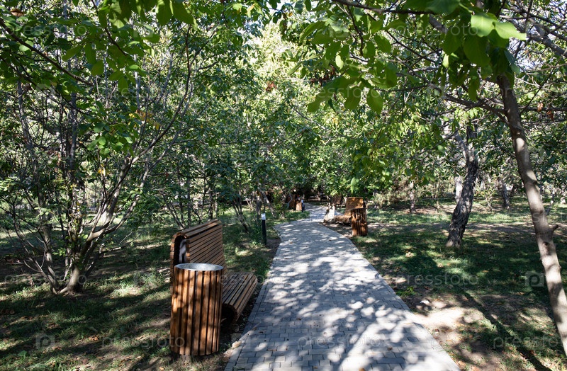 Дорожка из каменной плитки в ореховой роще Анапы летом