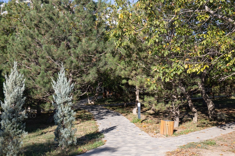 Дорожка из каменной плитки в ореховой роще Анапы летом