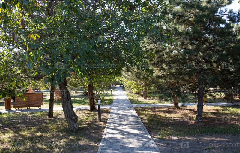 Дорожка из каменной плитки в ореховой роще Анапы летом