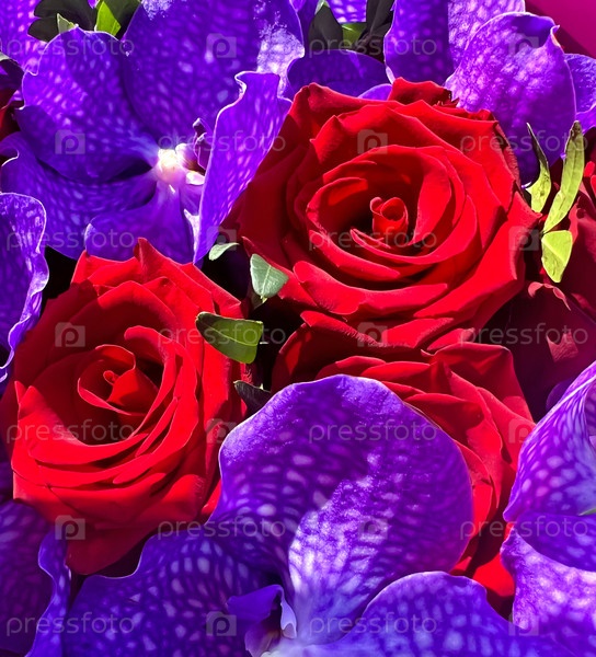 Яркий красочный букет из красных роз и фиолетовых орхидей
