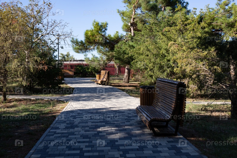 Тень дерева на земле и скамейка в парке в ореховой роще Анапы летом