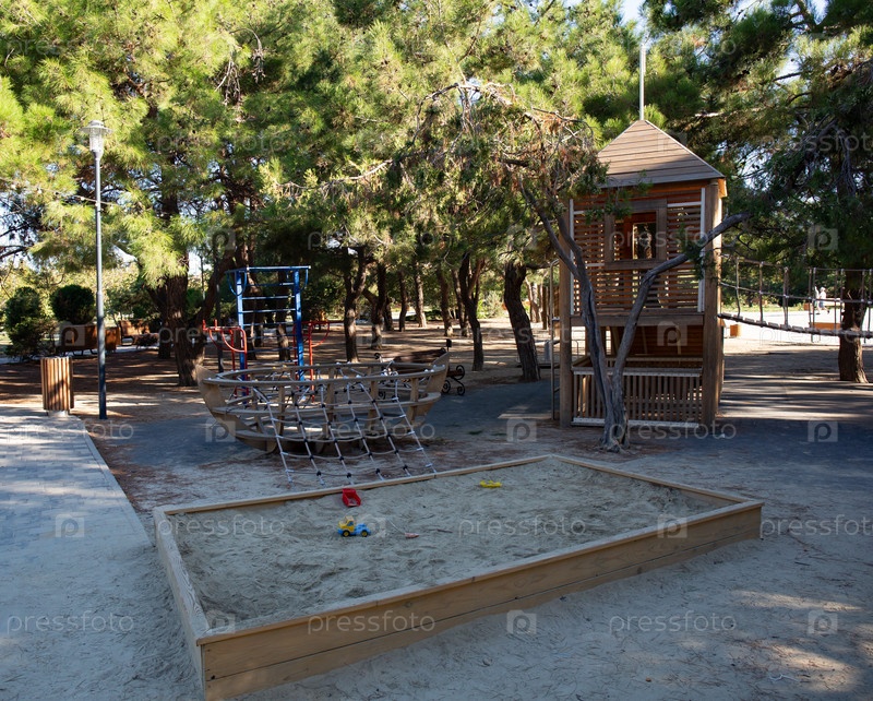Деревянная беседка в парке на фоне сосен в ореховой роще Анапы летом