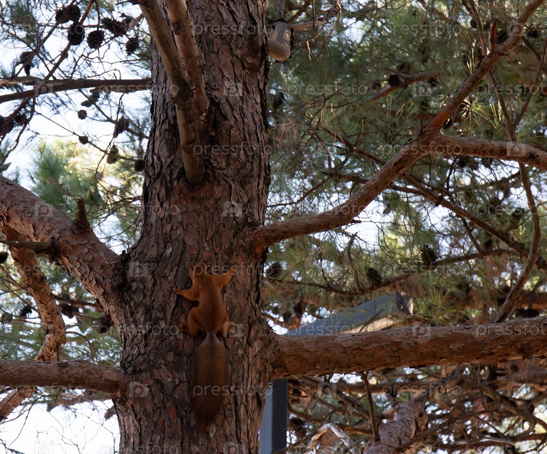 Белка на дереве в лесу. Рыжая белка на дереве в ореховой роще Анапы летом