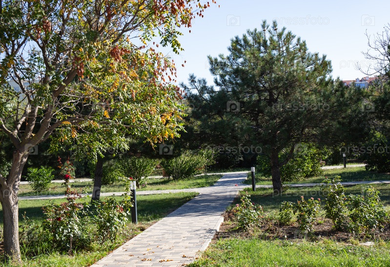 Дорожка из каменной плитки в ореховой роще Анапы летом
