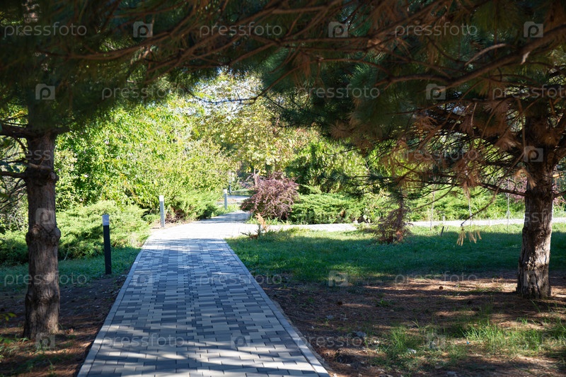 Дорожка из каменной плитки в ореховой роще Анапы летом