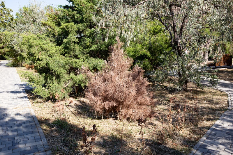 Сад с кустами и деревьями в солнечный день ранней весной в ореховой роще Анапы летом