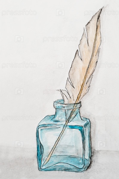 Перо и чернильница. акварельная живопись. перо в чернилах. символ поэзии и винтажных надписей. акварельная краска для рисования и перо для письма. бланк