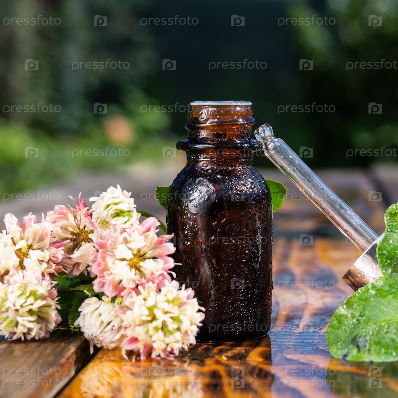 Эфирное масло из клевера на деревенском столе, клевер, эфирное масло, аром терапия, оздоровление, натуральное, на травах. Янтарный флакон в окружении цветов клевера. Экстракт или масло клевера с цветами используется в косметологии, салоне, для ухода за ли