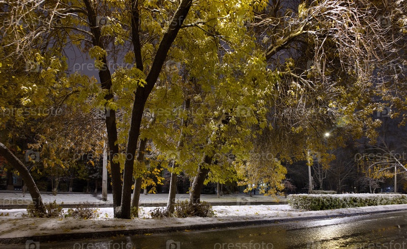 Россия, Новокузнецк. Вид на желтые березы на заснеженных аллеях ночного города в начале осени