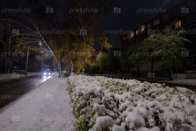 Россия, Новокузнецк. Вид на желтые березы на заснеженных аллеях ночного города в начале осени